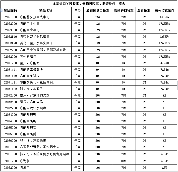 應(yīng)廣大用戶需求,青島金邦國際物流整理并發(fā)布“凍品進口關(guān)稅稅率、增值稅稅率、監(jiān)管條件一覽表”。該表詳細(xì)列明了常見凍品的進口稅稅率及海關(guān)監(jiān)管條件,其中凍雞肉,包括整雞、雞爪、雞翼(不包括翼尖),其進口關(guān)稅稅率為0,詳