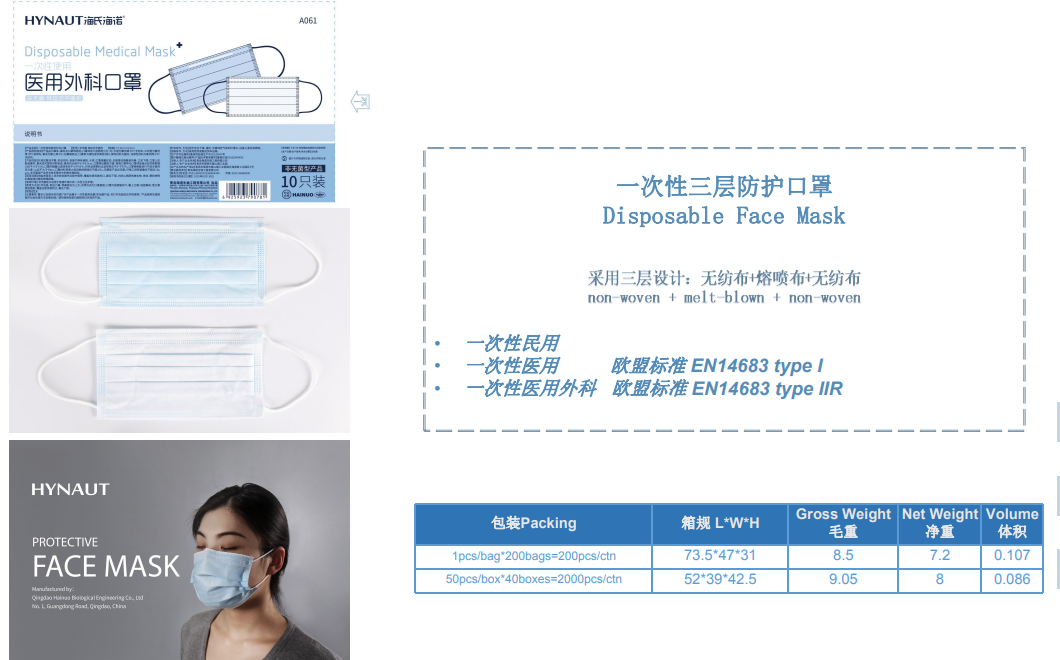 海氏海諾,白名單,出口醫用口罩,青島口罩廠,出口一次性平面口罩,RI\RII標準口罩